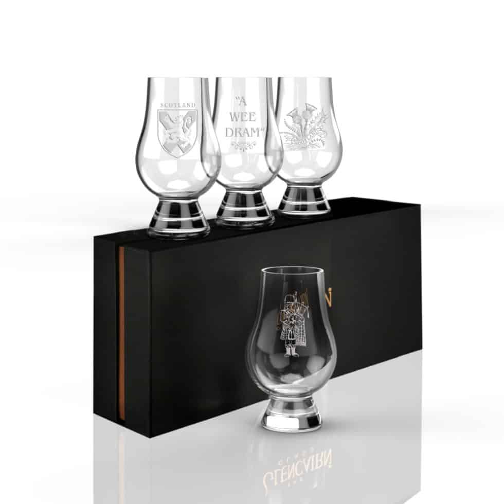 Ideal for blenders and whisky enthusiasts alike, the Glencairn Glass is considered the definitive glass for whisky. Featuring four Glencairn Glasses decorated with four different Scottish designs, this gift set is just perfect for a whisky lover who loves Scotland just as much. The four designs included in this set are Thistle Ribbon, Scottish Shield, Scottish Piper and A Wee Dram.