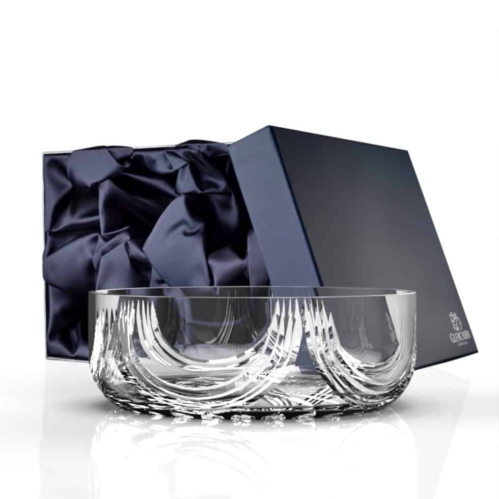 Our beautifully hand cut Montrose suite features sweeping cuts on the glassware inspired by the folds of the Scottish kilt. The crystal bowl is supplied in a luxurious navy gift box lined with navy satin, perfect for gifting to family and friends.